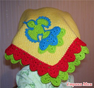 Основное полотно косынки связано в две нити спицами №3; полоски косы – в одну нить спицами №2, 5; обвязка, аппликация – в одну нить крючком №2.