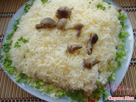 Салат слоеный с грибами - сытный и вкусный салат с ветчиной, сыром и грибами.