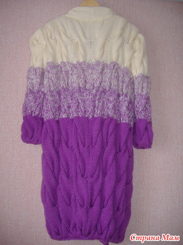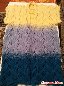 Набираем 422 петли, и в этом кардигане скорей всего нет изнаночных петель, (если ошибаюсь поправьте), разделяем полотно на 14 частей по 30 петель в каждой, т. е. косы будем вязать с двойным встречным перехлестом в 10 рядов.