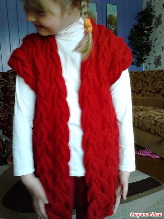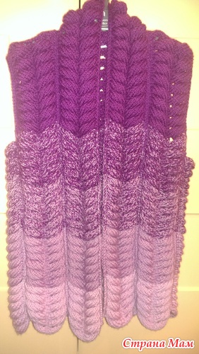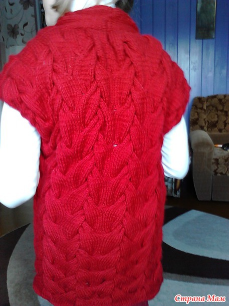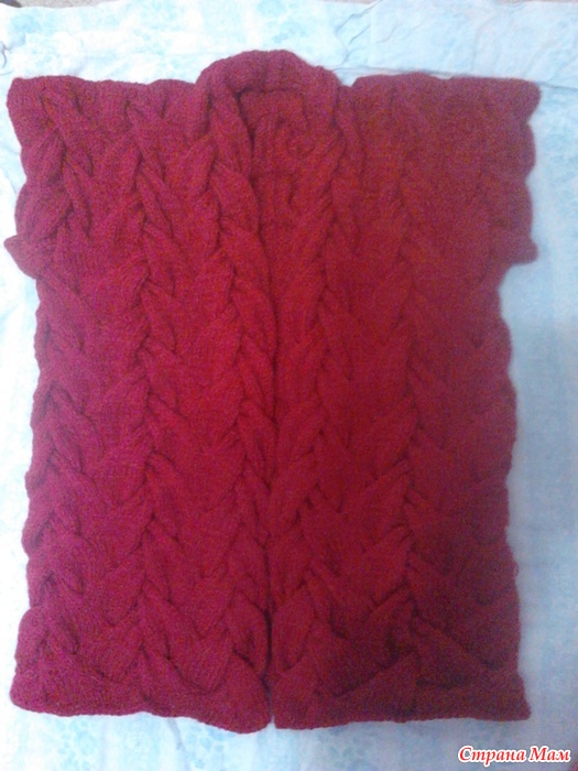 По поводу выкройки,... распределяем 6 кос на спинку, и по 4 на полочки, в пройму уходит либо 1, либо 2 косы, пройму обсудим позже, я думаю в пройму закрыть 1 косу, в предыдущем моем лало было 2 косы (4 на спине и по 2 на полочки, горловину полочек убавляла на 1 косу после проймы убавляла в каждом лицевом ряду по 2 петли) в жилете думаю будет лучше смотреться с 6 косами на спине, на полочках оставляем 3 косы, крайняя коса уходит в воротник