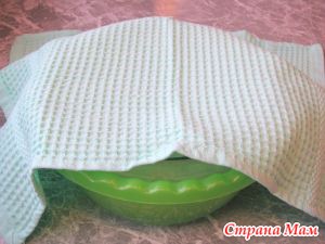 Я наливаю в миску теплую воду, в нее ставлю емкость с тестом.
