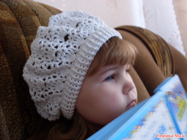 Этими ниточками вязала вообще первый раз. Так что пока ничего сказать о них не могу, берет еще не постиран. Но на Осинке, например, девчата ничего плохого о них не писали, вроде. Резиночку вязала крючком №2, 3 раза вверх веерочки вязала крючком №2,5 (но вот мне кажется, что он не соответствует этому номеру, великоват как будто , может потому, что они разных производителей), затем снова перешла на №2. Сначала даже думала все распустить и вязать только №2, но когда померила на дочь, всем понравилось. Решила оставить так. Вообще это мой первый опыт вязания таких ажурных головных уборов, до этого только шапочки вязала столбиками.