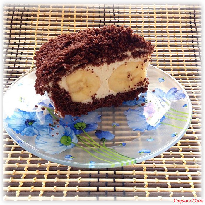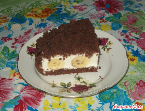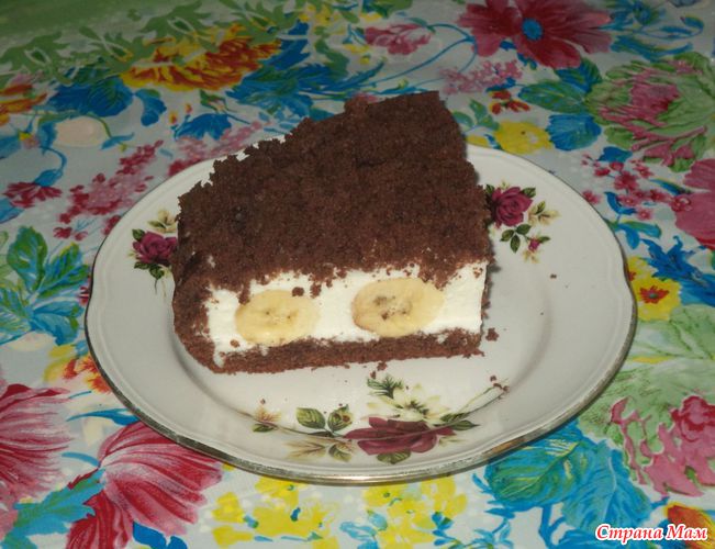 Нежный и очень вкусный торт "Норка крота" с бананами нарезать на кусочки и можно подавать к столу.