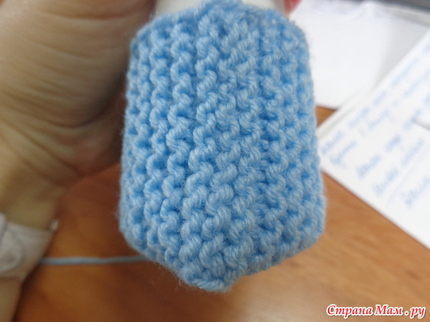 и провязать 12 рядов отворота платочной вязкой (вязание начинать, повернув образовавшимся швов к себе), петли закрыть. Голубую нить обрезать.