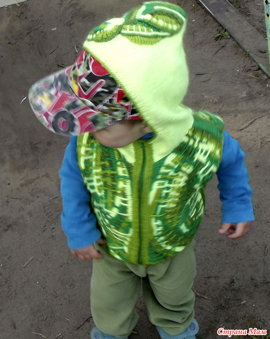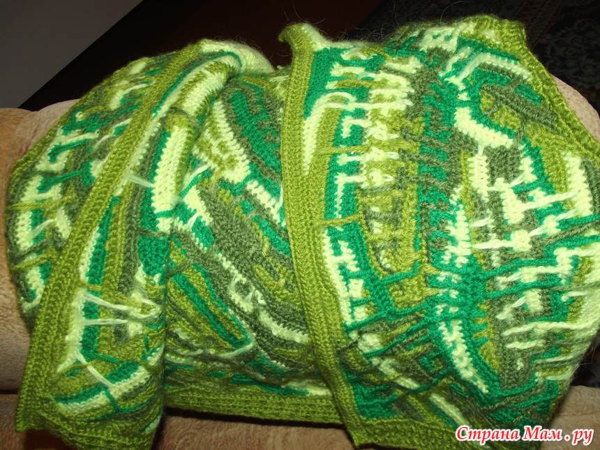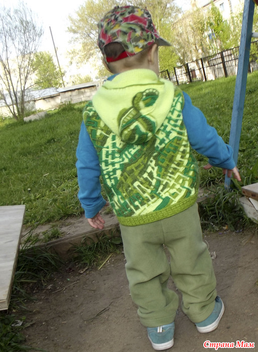 Мы назвали это "крейзи-жаккард" ) Обвязка столбиками с накидом, по низу рельефная резинка, капюшон связан лицевой гладью, задекорирован двумя фриформенными скрамблями.