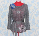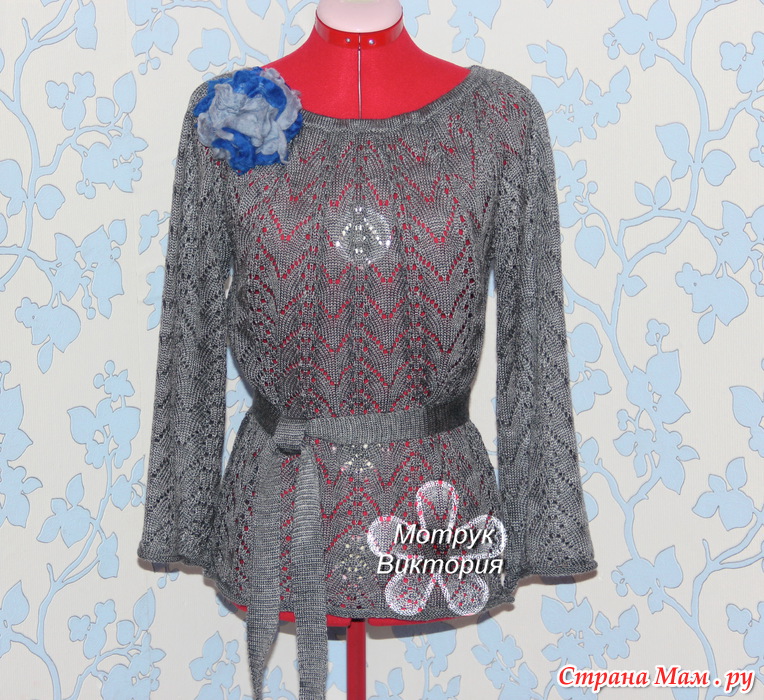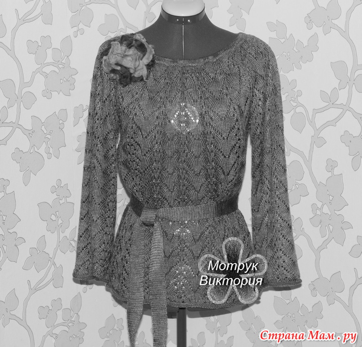 Блуза связана в 3 нити пш на сильвер 840. горловина собрана на резинку, размер получился универсальный, с поясом можно и на 44, а на 50 можно без пояска, смотрится и без пояса симпатично. Пыталась натянуть на свой 56 ))))). Цветок валяла мокрым способом-это уже второй опыт))))