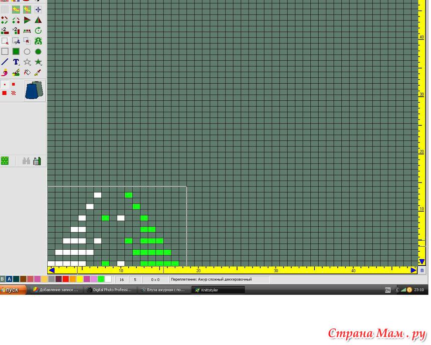 узор для спиц переложила в программу Книтт Стайлер, конечно в машинном исполнении узор получился не такой рельефный. но все таки обзавелась новым ажурчиком