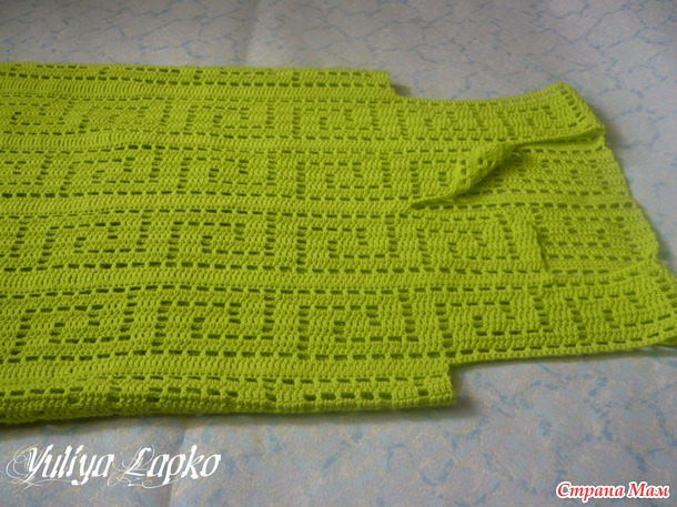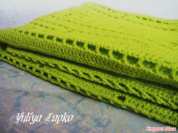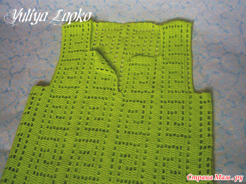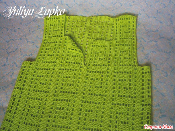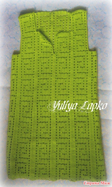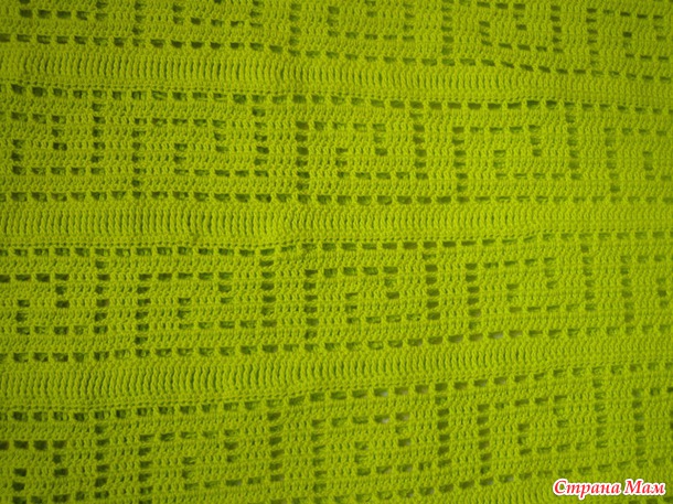 Использовала пряжу "Вита ЛИРА", 50 гр./150 м, 60% хлопок, 40% акрил, цвет 5026 салатовый. Крючок 3.00 мм. Ушло почти 7 клубочков. Размер 48-50.