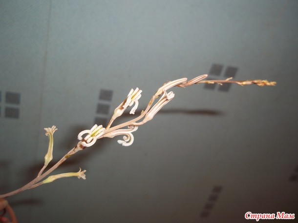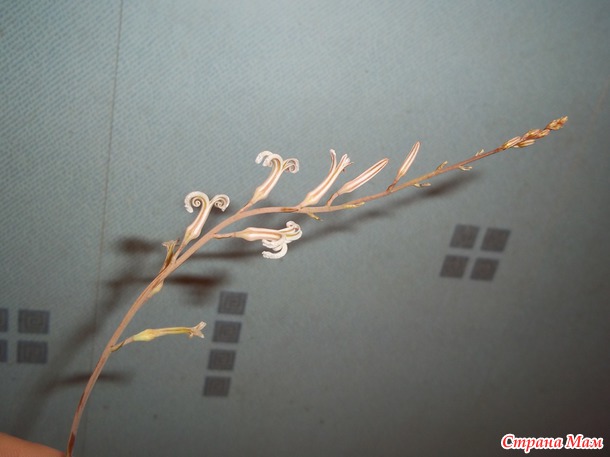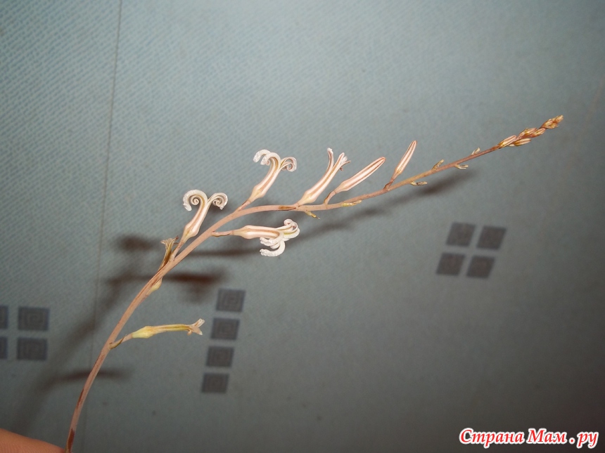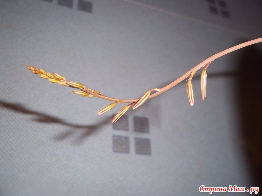 Потом появилась цветочная стрелка у хавортии полосатой. У неё стрелочка более тонкая и гибкая, но не менее длинная.