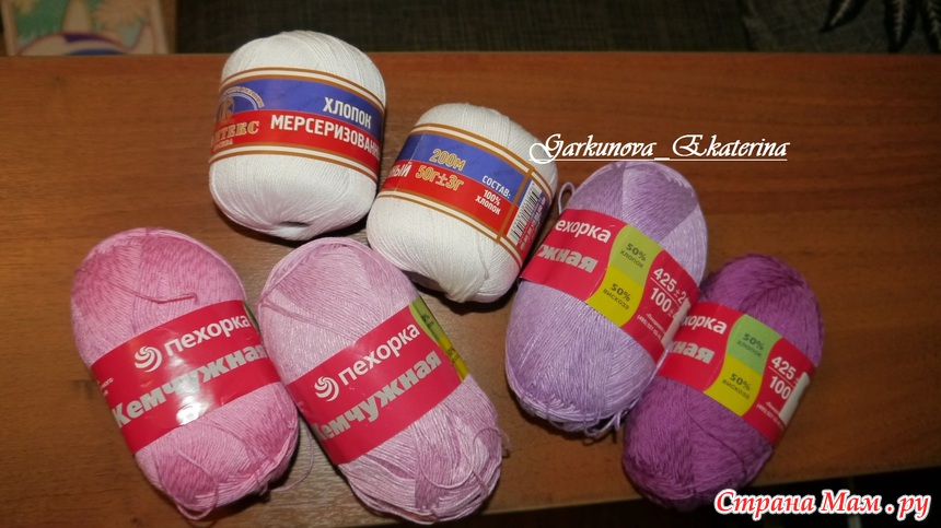 Ниточки использовала такие. Белые - хлопок от Камтекс, цветные - Пехорка жемчужная, хлопок с вискозой. Крючок Кловер 2,25.