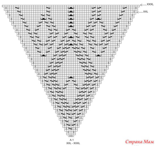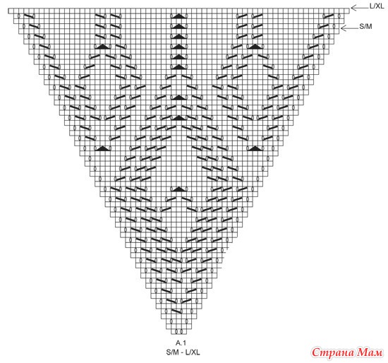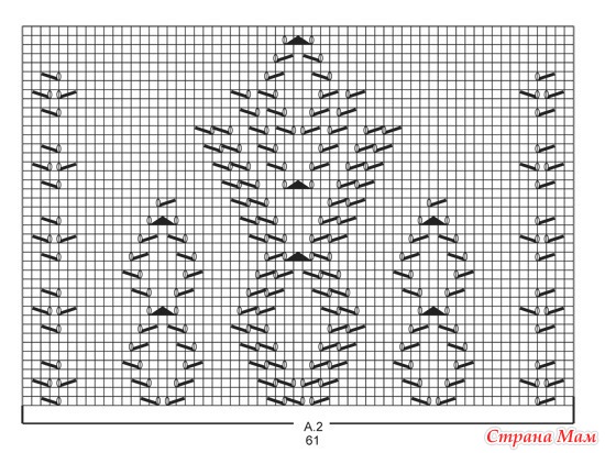 Вязать рядами. В след. лиц. р. продолжить: вывязать из первой петли ряда 2 петли, 0-2-4-6 лиц. п., 61 п. по схеме А.2, 0-2-4-6 лиц. п., вывязать из послед. петли ряда 2 петли. Далее продолжить след. образом: 1 кром. п., 1-3-5-7 п. лицевой гладью, А.2, закончить ряд симметрично.