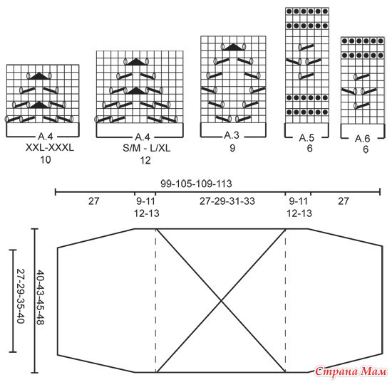 Для всех размеров: после полного верт. раппорта по схеме А.2 вязать: 1 кром. п., 27-32-36-42 п. лицевой гладью, 9 п. по схеме А.3, 27-32-36-42 п. лицевой гладью, 1 кром. п. Выполнить 2 верт. раппорта схемы и далее провязать еще 0-6-0-4 р. лицевой гладью. В след. лиц. р. равномерно убавить 3-1-1-3 п. и выполнить 1 изн. р. изн. п. Продолжить вязание по схеме А.4 на всех петлях, выполнив 2-2-3-3 раза верт. раппорт узора. Далее вязать по схеме А.5 и в это же самое время в 1-ом ряду равномерно убавить 0-0-2-0 п. Закрыть петли после верт. раппорта узора.