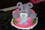 Делала сестрёнке мужа на день рождения, хотела сымитировать коробочку, из которой выглядывает мишка (правда на коробку мало похож). Что получилось, то получилось