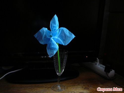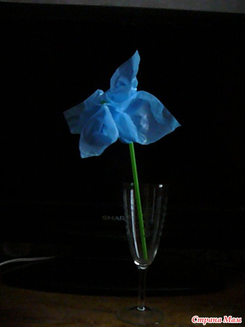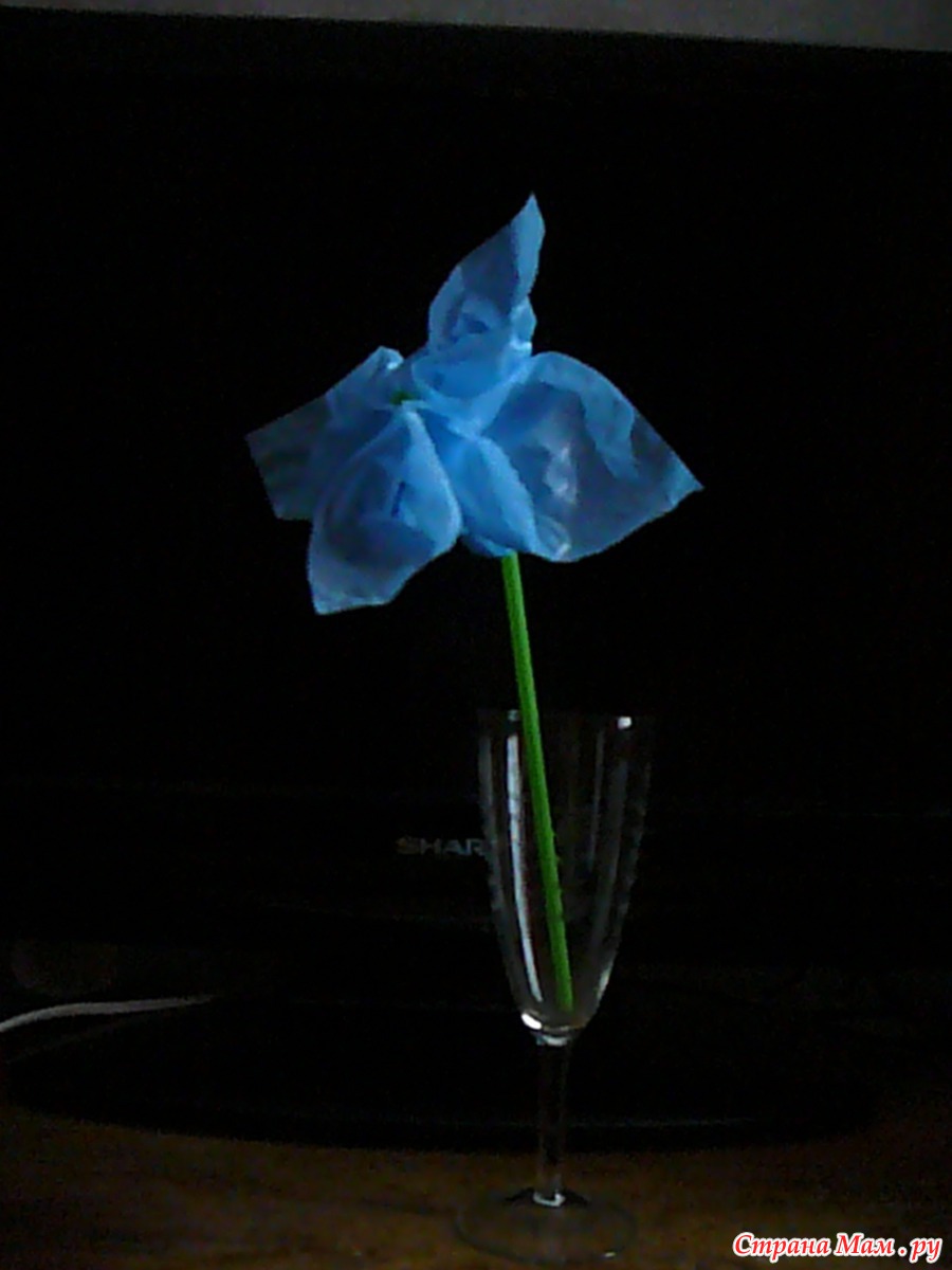 Я складывала пакет, а доча его степлером скрепляла, потом в "бутончике" прорезали небольшое отверстие и вставили зеленую трубочку и вот что получилось: