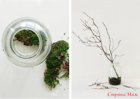 1. Мох укладываем на дно трехлитровой банки. Ставим ветку.
