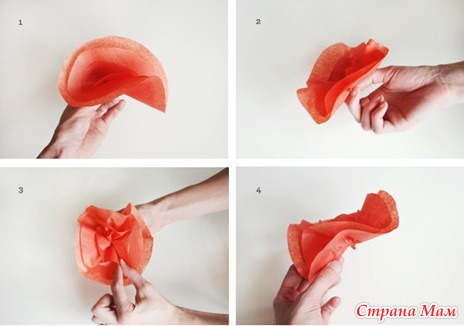3. Складываем их: От большого круга к малому. Руками обозначаем центр. Расправляем лепестки цветка. Скрепляем сердцевину цветка степлером.