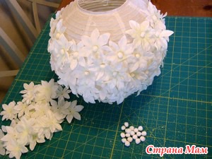 При помощи термоклея приклеиваем цветы и шарик к фонарю, так чтобы они покрыли все поверхность бумаги.
