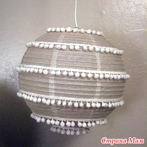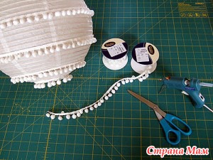 Бахрому клеем к фонарю по кругу. Вставляем шнур и у Вас уже готов второй фонарик.