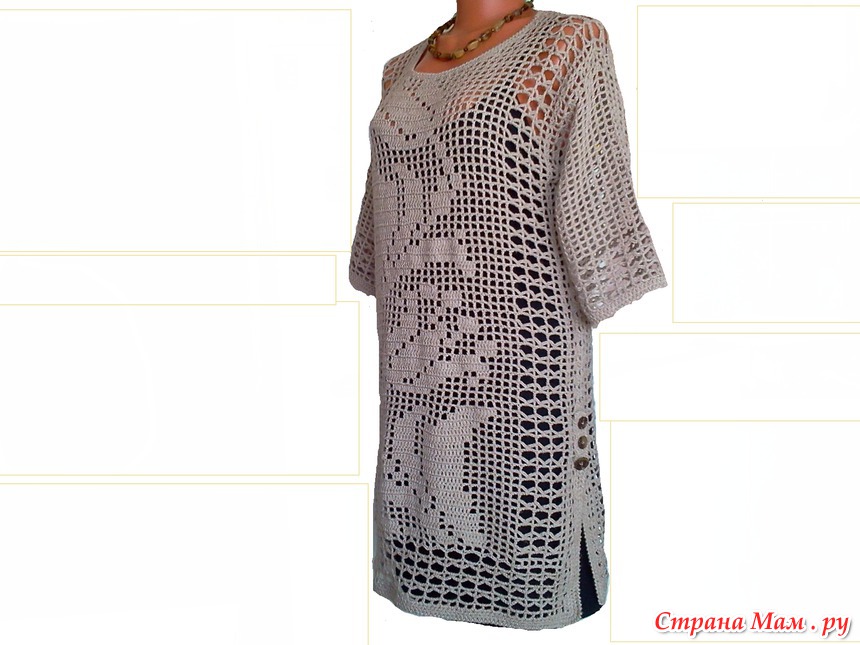 Осенью купила лён на юбку... Никак не могла решить, как связать... А весной получилась такая туника из этих ниточек... ушло около 450 гр. ( 100 гр- 280 м) Крючок ADDI № 3 На жару толстовато, но в прохладное время года, Я ДУМАЮ, БУДЕТ НОСИТЬСЯ,