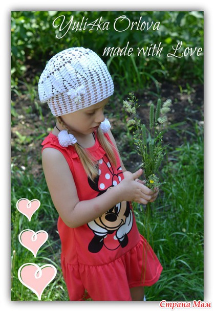 На днях у меня связался беретик или шапочка, даже не знаю к какой категории его отнести... в общем результатом довольно не только я, но и моя любимая дочь для которой я так старалась. Пряжа у меня Денди (Москва) Камтекс 100% хлопок, 50г/330 метров, крючок 1,15. Сегодня на улице хорошая погодка и мы решили не терять даром время...