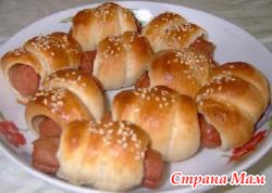 Каждую сосиску оборачивают вокруг тестом и кладут на противень. Противень накрывают полотенцем и дают постоять 20 мин.