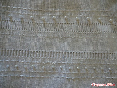 Беленькая сумочка вышивалась простейшим швом вперёд иголку, расшивалась бусинами. Жить не могу без мережек, потому без них тут никак). Здесь использовала мережку "столбик" и "раскол".