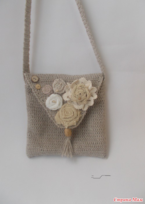 Связала вот такую сумочку. Давно собиралась, наконец свершилось. Внутри подкладка с кармашком. Очень нравятся розочки из ткани. ими и сумочку украсила.