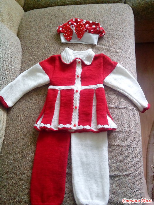 Началось все с покупки шапочки. Связала костюм для дочки. Рост 92см. Нитки "Детская нежность", 300 гр:3 моточка белого цвета и 3 моточка красного. Спицы 3. Обвязка крючком. Кофточка в 2 нити, штанишки в одну. 5 пуговиц.