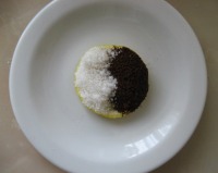 Свежий лимон нарезать тонкими кружочками и выложить на блюдо. Каждый ломтик мысленно разделить на две части, одну посыпать молотым кофе, другую – сахарным песком.