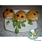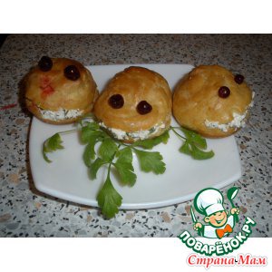 Приготовим заварное тесто: вскипятить воду, добавить маргарин, соль, муку. Все это перемешиваем до однородной массы, даем ей остыть, после чего добавляем сырые яйца. Вновь перемешиваем до однородной массы. Кондитерским шприцем выкладываем на противень в виде маленьких булочек.