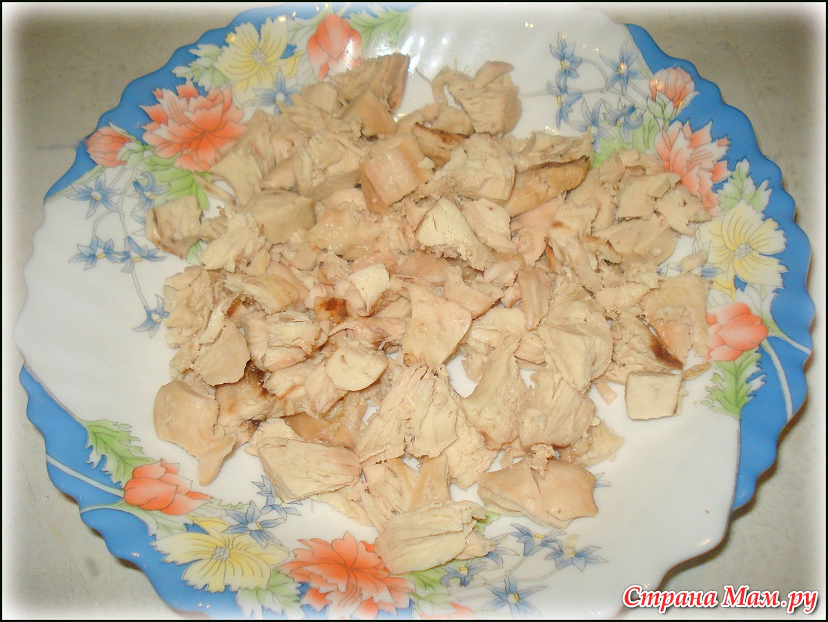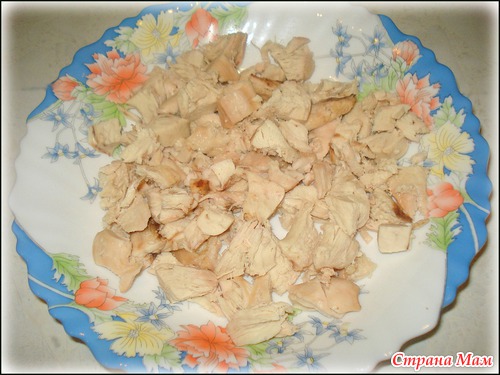 Отвариваем куринное филе, режем на кусочки. (Вместо куриного филе можно взять свинину)