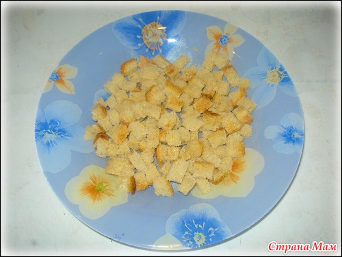 Готовим сухарики: Режем на кубики хлеб, ставим их в микроволновую печь на 2 минуты. (В готовые сухарики можно добавить чесночку)