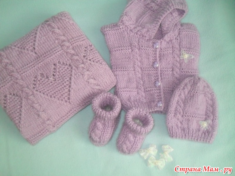 Продаю комплект на выписку ручной работы. Состоит из пледа(80*80), кофточки с капюшоном, шапочки и пинеток. Выполнен из нежнейшей пряжи мериноса. Ажурный узор "сердечки"+косы придаёт комплекту торжественность и ощущение легкости, воздушности, хотя на самом деле ещё и тёпленький.