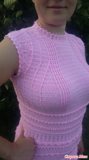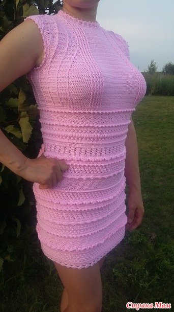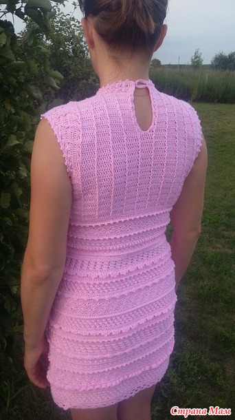 Вязать платье начала отрезное под грудью вверх. Вязала сразу поворотными рядами, чтобы рисунок был одинаковый после разделения полотна на перед и спинку.