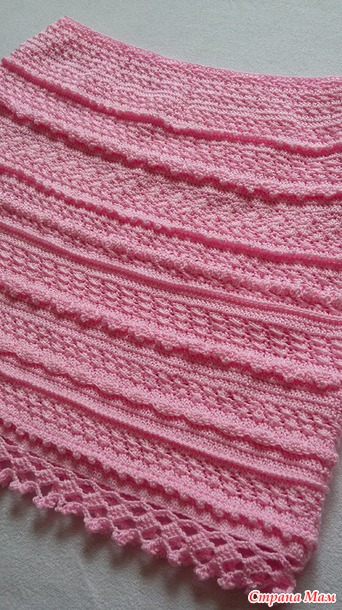 Юбку вязала по кругу. Для нее набрала петли из верха и начала вязать вниз тем рисунком, который приходил в голову). Рюшки были связаны таким же образом. Их вязала по изнанке, так они не топорщатся вверх.
