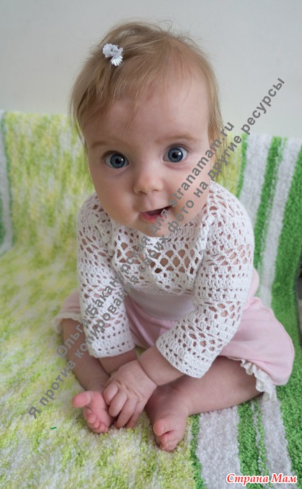 Хотелось сделать своей красавице что-то очень женственное, но практичное, потому что в возрасте 5-6 месяцев всякие красивые юбочки-платьица – не самая удобная одежда. Вот что получилось. Это в 5 месяцев.