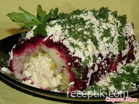 4. Затем на свеклу сверху натереть картошку, помазать майонезом. Затем на картошку выложить заранее замаринованный в уксусе или лимонном соке нарезанный мелко лук.