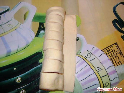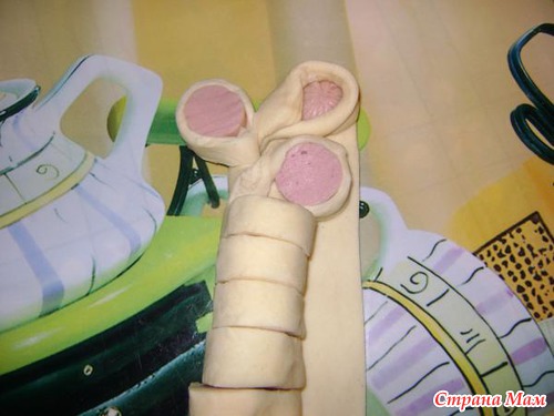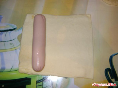 Тесто разрезаем на прямоугольники. На каждый прямоугольник выкладываем по сосиске.