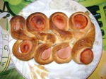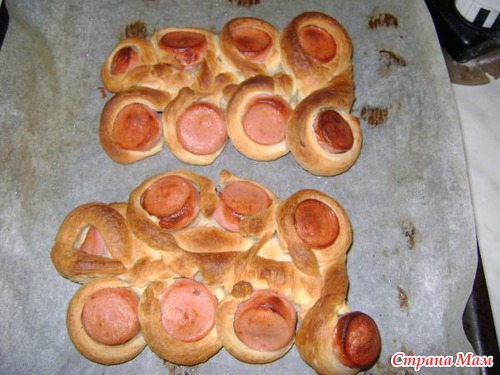 Выкладываем наши косички из сосисок на смазанный маслом противень и отправляем в духовку.