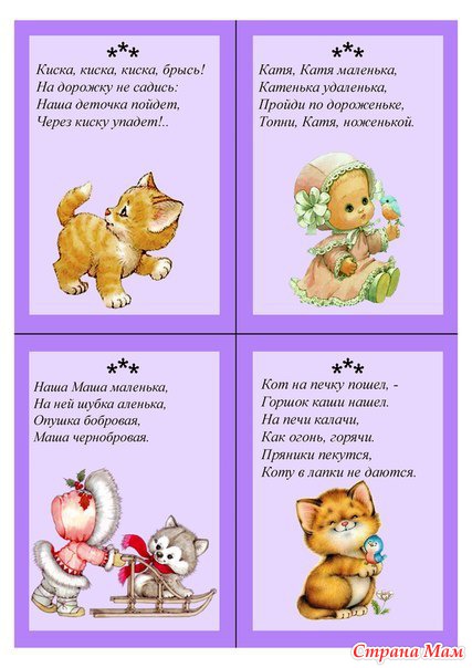 Потешки и пестушки - это небольшие стихотворения-приговорки, которыми сопровождают любые занятия с ребенком или действия самого ребенка - потягивание со сна, одевание и т. д. Пестушки сопровождают игру с ребенком, когда взрослый выполняет движения «за него», играя его ручками и ножками, когда младенцу еще недоступны такие движения, как повороты тела, он не может целенаправленно действовать руками, не умеет самостоятельно садиться, ползать, вставать у опоры. Потешки рассчитаны на активность самого ребенка, когда он выполняет самостоятельно игровые движения и соотносит их с содержанием песенки-потешки.