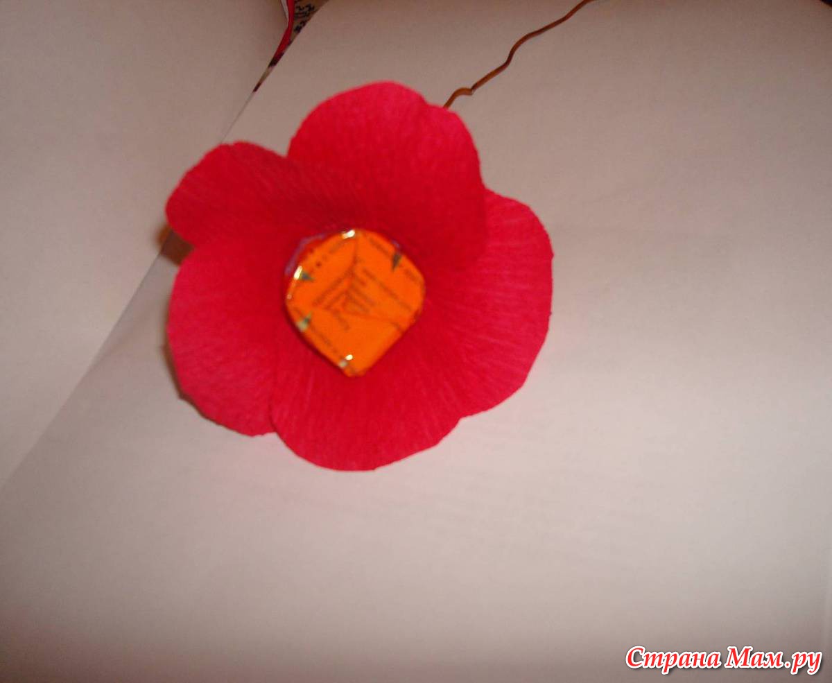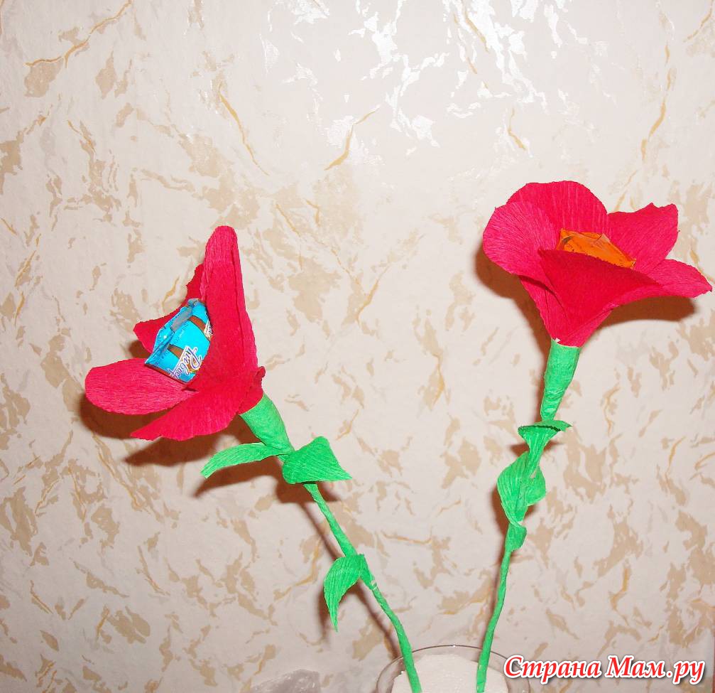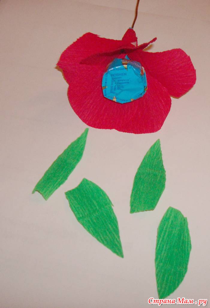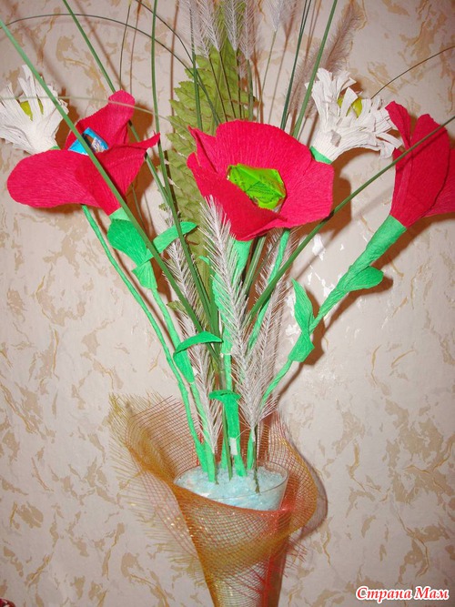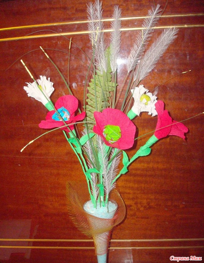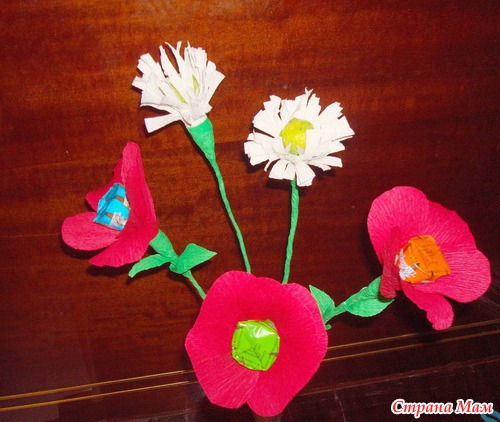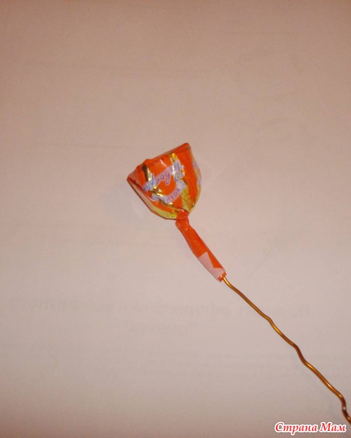 Мне понравилась идея делать букеты из конфет. Это мой первый опыт. Я взяла конфеты, прикрепила к проволоке