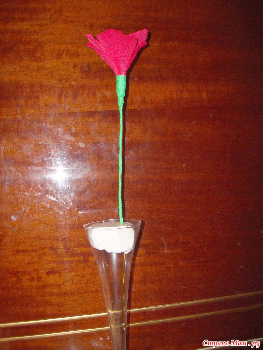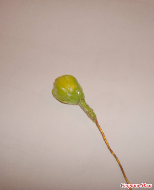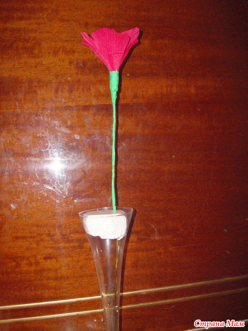 Стебель обмотала зеленой бумагой. Оставался у меня корпус от гелевой свечки, я туда положила кусок пенопласта, затем вставляла цветок
