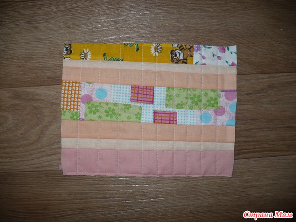 Лоскутки у меня были, нашелся и кусочки ватина, непристроенные. Первым этапом просто нашила на ватин лоскутки. Получилось будущее дно и боковинка: