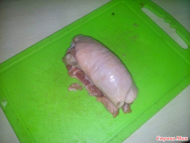 Бёдрышко тоже промокнуть салфеткой, для удобства сворачивания. На край мяса положить 1 с. л. без горки начинки.
