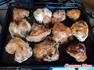 Для приготовления смешиваю майонез и кетчуп добавляю чеснок и спейции по вкусу( все зависит от фантазии и содержимого моего шкавчика с приправами). Смазываю бёдрышки получившейся смесью и оставляю в кастрюльке на 10 - 15 мин. затем выкладываю на противень и заливаю остатками смеси. где-то минут через 30 достаю из духовки, вот такую красотень. Всем приятного аппетита.