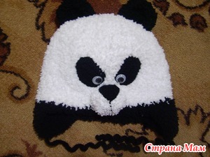 Шапочка панда. Опять же из любимых мной ниточек "Кроха". Ушло 2 мотка белого и половинка черного.