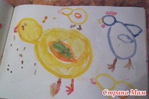 Творчество младшенькой: тут солнышко и дождик идет: Дороги: Овалы нарисовала и сама раскрасила: Баба - яга на метле с палками и кошка плохая)): Цыпленка раскрасила и зернышки дорисовала: фрукты раскрасила: