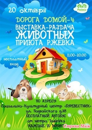 Пожалуйста, помогите распространить сообщение! Чем больше людей распространит это сообщение, тем больше хвостатых уедут домой. Друзья! Очередная выставка-раздача животных приюта Ржевка «ДОРОГА ДОМОЙ»-4 пройдёт в субботу 20 ОКТЯБРЯ!!! 2012 г в СКЦ "БУРЕВЕСТНИК", по адресу ул. Подвойского д 38 (м Дыбенко) 20 октября 2012 г с 11 до 20 ч пройдет выставка-раздача животных приюта Ржевка, организованная волонтёрами. Около 100 кошек и собак будут ждать своих хозяев. Читать далее»