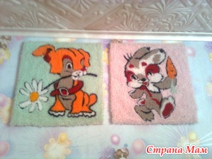 А вот мои махровые картины. вышивала специальной иглой, скорее крючком. с тыльной стороны закрепляла все клеем ПВА. Можно вышивать подушки, они такие мягкие получаются. А у меня - подарок племянникам в детскую