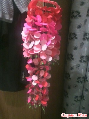 Делаем из проволоки каркас, оборачиваем цветной бумагой. Затем по кругу подвязываем капроновые нити, можно разной длины. Из цветной бумаги вырезаем кружочки, тоже можно разного диаметра, разного цвета. Нанизываем на нити с помощью иголки, фиксируем узелками, а в конце бусинкой. Люстра готова. Лампочка должна быть энергосберегающая, она не нагревается.